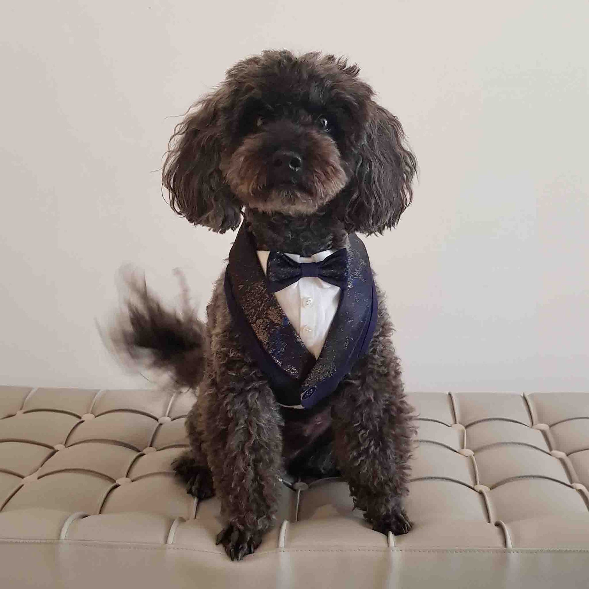 Our dog tuxedo for wedding is crafted from high quality materials such as luxurious silk and velvet, giving it a rich and refined appearance. The fabric is typically black or a dark hue, echoing the traditional men's tuxedo. In fact some designs also include a detachable bow tie, completing the formal look.